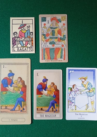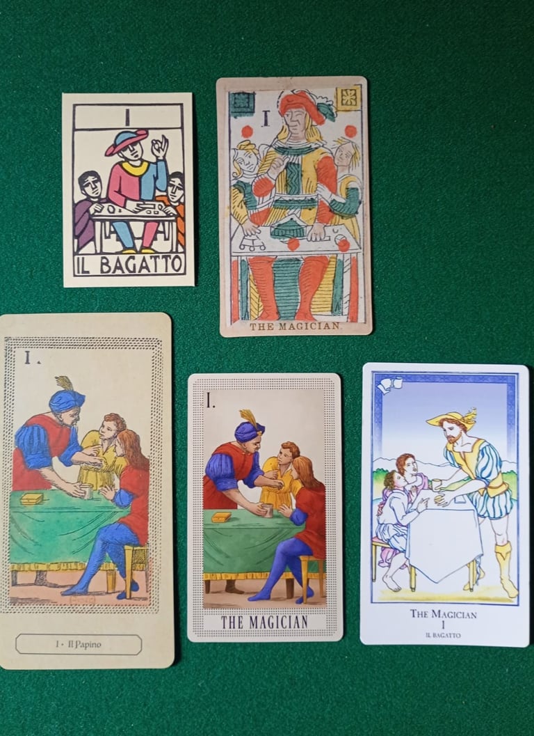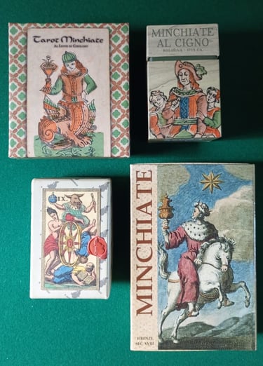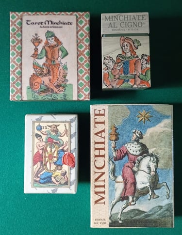 FOTO 1: Fila superior Tarot minchiate Al Leone di Girólamo (EMP), segunda fila Minchiate Al Cigno (EMP), tercera fila Minchiate Fiorentine (LMP), última fila Minchiate Etruria (LMP).