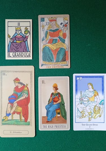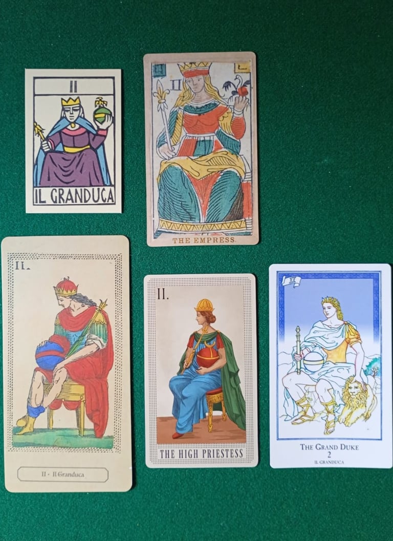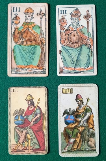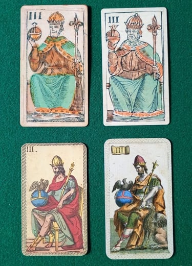 En la foto 3 vemos al Papa Uno o Papino (siempre acompañado por dos niños y/o Jóvenes), y en la foto 4 al Papa Dos, nuestro cuestionado Gran Duque, que hace referencia al personaje que aparece en las barajas de Patron Tardío, que efectivamente son posteriores a 1569, así que a mi modo de ver el nombre es perfectamente coherente, lo que ocurre es que no sabemos como se llamaba antes... Dummett comenta que Antonio Malatesti en su poema sobre las minchiate de 1683 dice "Papa por nombre y rey en apariencia", tal como podemos observar. Sin embargo, en el Poemario Anónimo Florentino de 1553 "I Germini, sopra quaranta meritrice della città di Fiorenza" - que asigna una prostituta florentina a cada triunfo de las minchiate- a la carta II le llaman La Lucía, quien declara en sus versos "de las Germini me han hecho la Reina" (Recordemos que Germini es otro nombre por el que se conoce esta baraja). En su libro Dummett parece muy confundido de que se le llame Reina a la carta número 2, pero nuevamente: es porque no conoce o no ha visto una baraja de Patron Temprano. Si nosotros miramos las dos EMP de la foto 4 (en la fila superior) podemos comprender con claridad por qué se le llama La Reina, ya que en las barajas de Patrón Temprano es claramente una mujer con una corona.