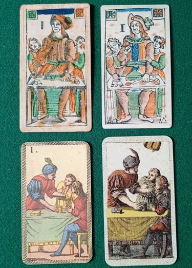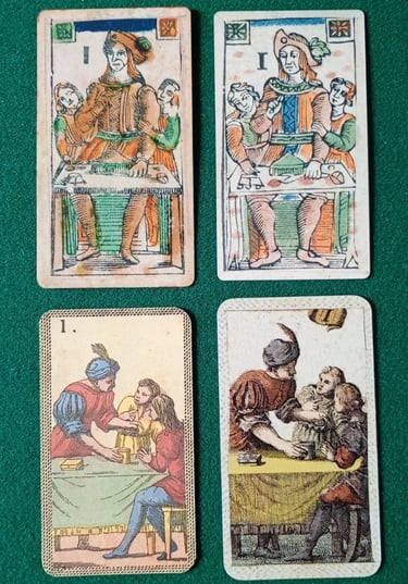 Partamos por el comienzo. En la foto 1 uno podemos ver los 5 papas en barajas que son reproducciones históricas. Las dos filas superiores corresponden al Patrón Temprano (Al Leone di Girolamo y Al Cigno, ambas de origen Boloñés) Las dos filas inferiores corresponden al Patrón Tardío (Minchiate Florentino y Minchiate Etruria, ambas de origen Florentino).