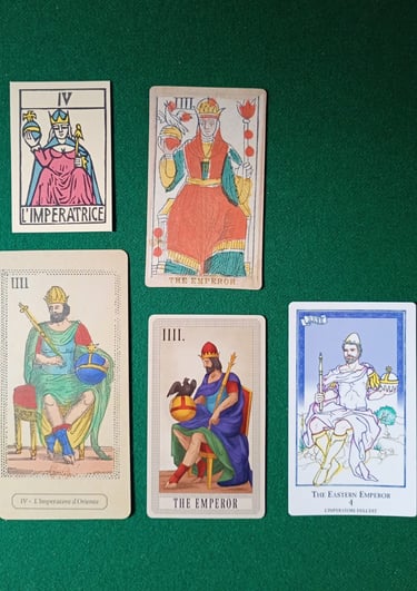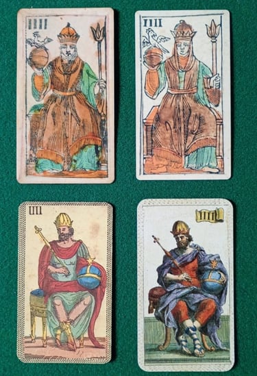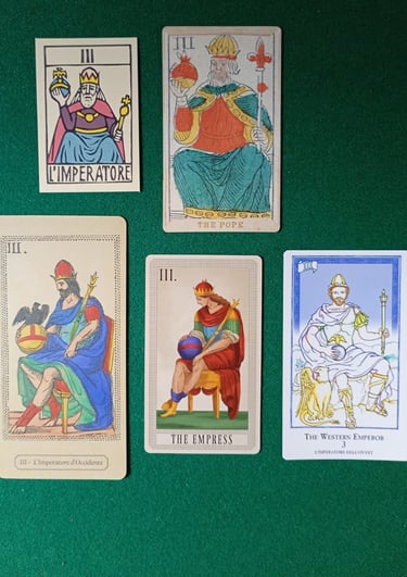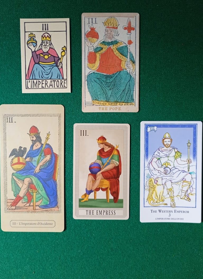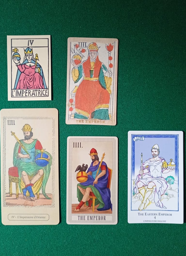 En la foto 12, vemos al/la Papa Cuatro, que en la fila superior (EMP) corresponde a la imagen de una Mujer y en la fila inferior (LMP) corresponde a un hombre. Es llamada por Al Solleone L'Imperatrice (La Emperatriz), y por Spencer's The Emperor (El Emperador), por favor fíjense que descalabro!. Laura Tuan L'Imperatore d'Oriente y Brian Williams The Eastern Emperor es decir le nombran correctamente Emperador de Oriente y Da Brigh le llama The Emperor (El Emperador), y reemplaza la imagen del Emperador de Oriente por la imagen del Emperador de Occidente. Ninguna de las dos barajas EMP nombra a La Papisa o La Emperatriz de Oriente.