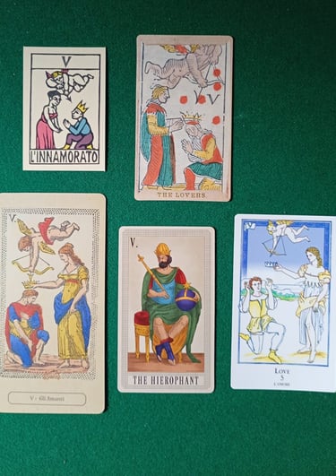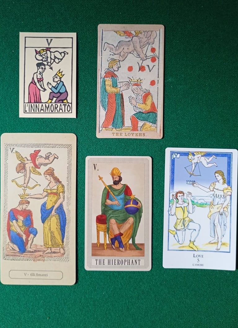 Finalmente, en la foto 13 tenemos al Papa Cinco, que Il Solleone llama L'Innamorato (El Enamorado), Laura Tuan Gli Amanti y Spencer's The Loverso (Los Amantes), Brian Williams Love (Amor) como Dummett, y Da Brigh... reemplaza la carta por el Emperador de Oriente y le llama The Hierophant (El Hierofante).